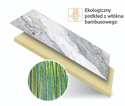 - Rdzeń bambusowo-węglowy (3 mm / 6 mm) – lekka, a jednocześnie wytrzymała struktura nośna zapewniająca stabilność całego panelu
